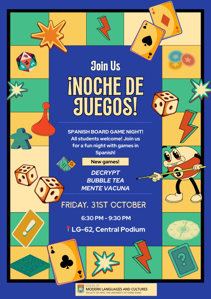 Organized by the Spanish Programme, this event is open to the entire university community. This is your chance to unwind with friends, meet fellow Spanish speakers/learners, and practice your language skills in a fun, casual setting. And yes, there will be free snacks and drinks!